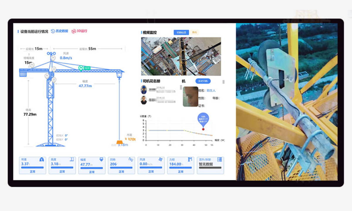 视频画面同步叠加起重量、力矩、风速、回转角度等关键参数,一眼掌握吊装风险。