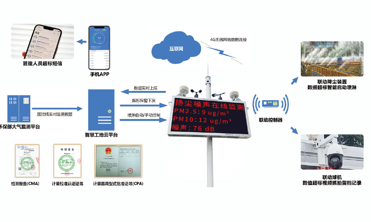 PM2.5、PM10、TSP、噪声、温度、湿度、风速/风向同步监测,1 min更新,误差≤±10 %,数据直传云平台。 -