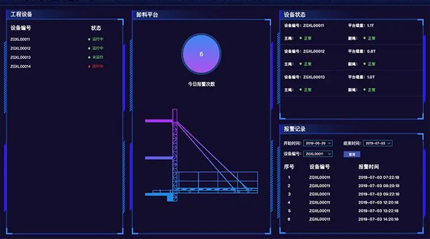 卸料平台监测系统是自主研发的实时监控系统,基于物联网、嵌入式、数据采集、数据融合处理与远程数据通信等技术,实时监测载重数据并上传云平台。具有随时查看卸料平台当前状态、查询历史记录、声光预警报警等功能,以提醒操作员及时采取正确的处理措施,有效地防范和减少卸料平台安全生产事故发生。